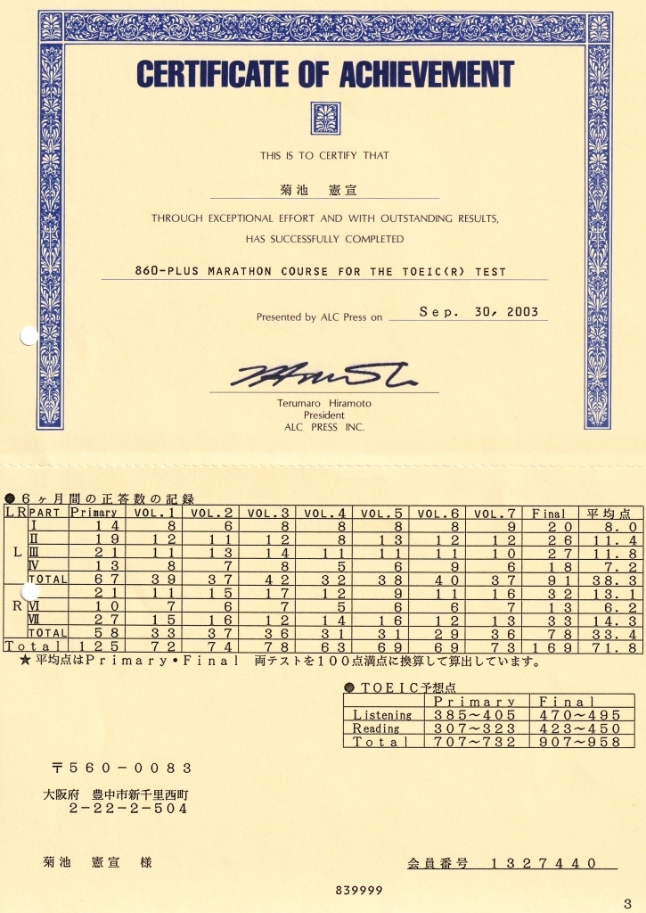 2003 TOEIC Test 860点スーパーマラソン通信教育-実施 & 修了証
